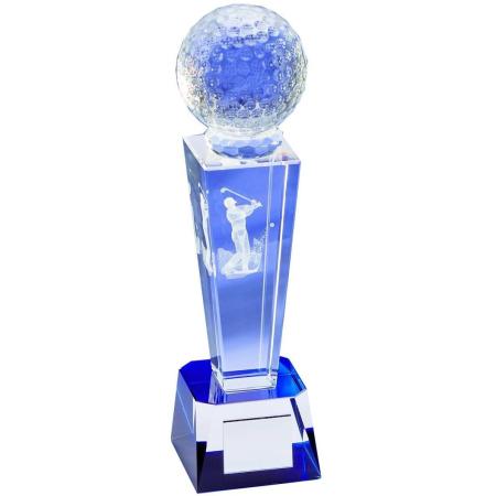 Edle Crystal Trophäe aus Glas mit 3D-Lasergravur im Inneren. Der Golfer scheint im Inneren der Trophäe zu schweben.