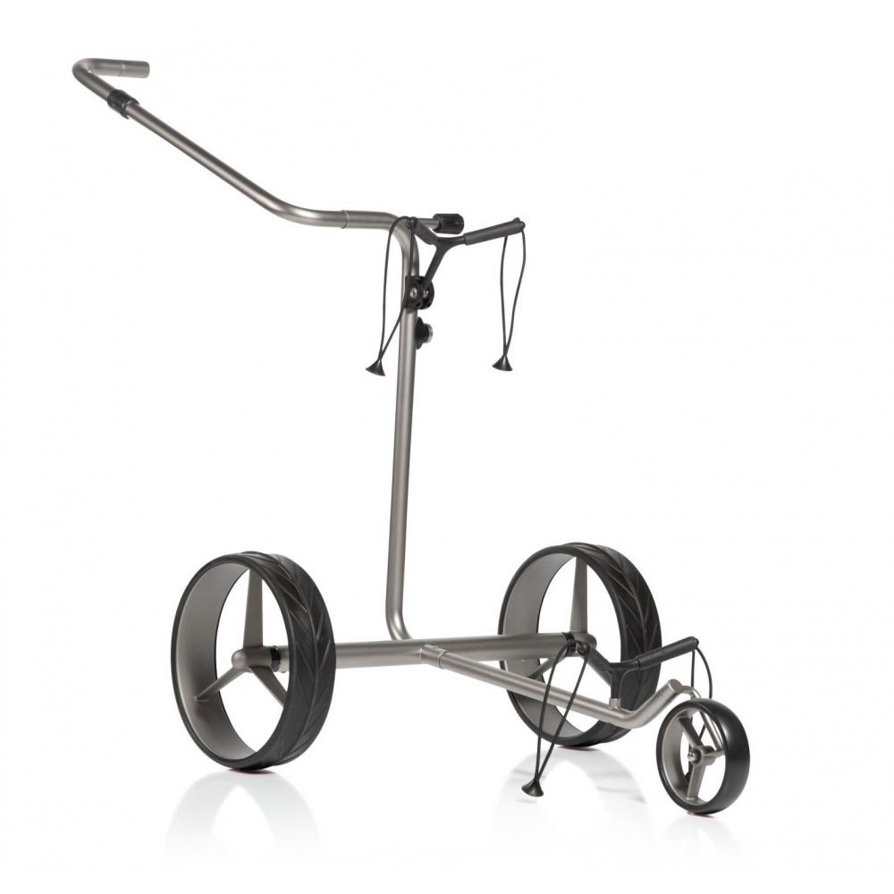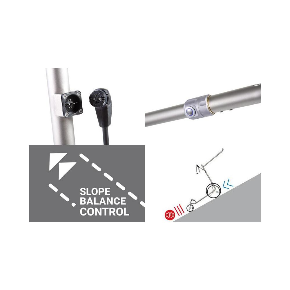 Der komfortable Caddy mit nur einer Steckverbindung und dem besonders flachen Packmaß von 65x60x10cm passt samt Zubehör in fast jeden Sportwagen-Kofferraum. Das intelligente Technikpaket sorgt für weiteren Komfort und beinhaltet leise Brushless Motoren mit einer beidseitigen elektronischen Parkbremse für sicheren Halt auf steilstem Gelände, Slope Balance Control (SBC®) für optimalen Hangausgleich sowie Magnetstecker und eine integrierte Ladestandsanzeige.