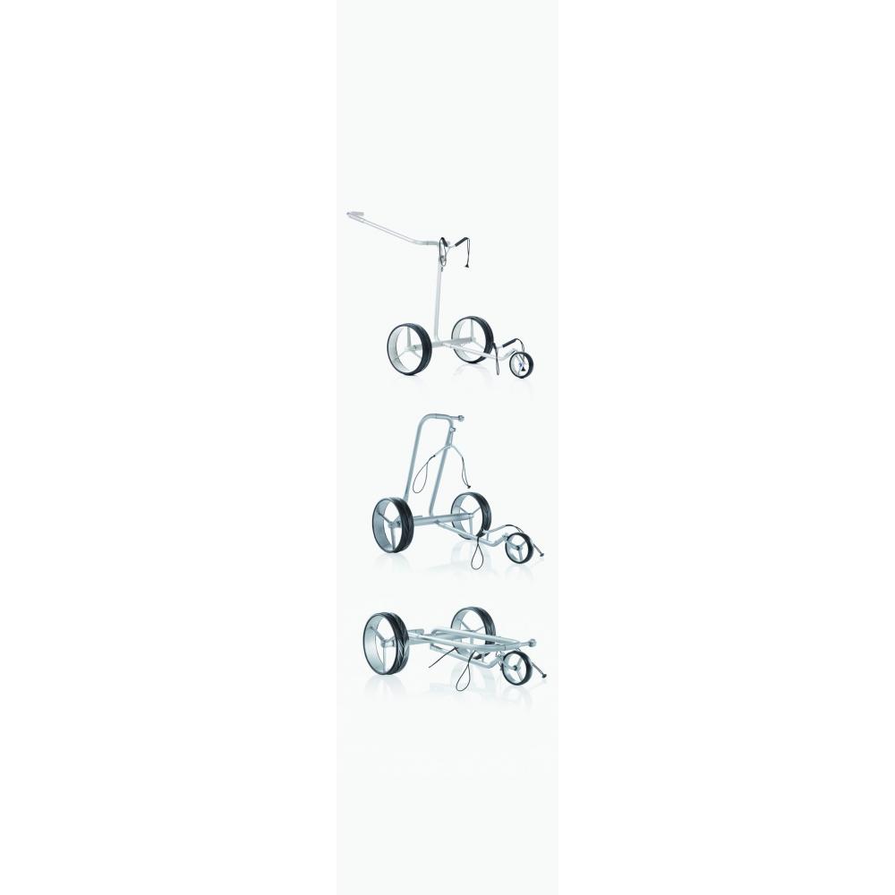 Auf Wunsch vieler Kunden hat JuCad den klappbaren Klassiker in Titan neu aufgelegt. Im gleichen Design wie alle JuCad Modelle, gefertigt aus Titan, wiegt er heute nur noch knapp 6 kg. Mit einem Handgriff ist der JuCad drive SL Titan Classic in Sekundenschnelle zusammengeklappt und bietet somit hohen Komfort, wenn ein Mini-Reisepackmaß benötigt wird. Mit einem Packmaß von 65x60x20 cm passt der leichte Caddy natürlich auch in jede Limousine. Ein umweltfreundlicher Lithium-Hochleistungsakku sorgt für reichlich Kapazität (bis zu 45 Loch) und wird nicht sichtbar im Golfbag untergebracht. Das intelligente Technikpaket der neuesten Generation sorgt für weiteren Komfort und beinhaltet leise Brushless Motoren mit einer beidseitige Parkbremse für sicheren Halt auf steilstem Gelände, Slope Balance Control (SBC®) für optimalen Hangausgleich sowie Magnetstecker und eine integrierte Ladestandsanzeige. Mit dem stufenlosen Gasgriff läßt sich der Caddy komfortabel steuern und bergab bremsen.
