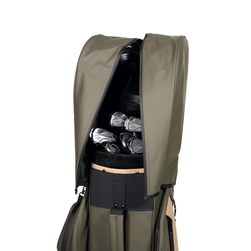 Dieses Bag der Extraklasse mit seinem aufwendig gesteppten Äußeren im Retro-Look und der wasserabweisenden Oberfläche im Leder-Design, mit toller Haptik, steckt voller Funktionen. Die vorderen zwei Außentaschen werden schnell und einfach mit Magnetverschlüssen bedient. Das obere Taschenfach mit Magnetverschluss sorgt für einen superschnellen Zugriff (z.B. für den Entfernungsmesser) und lässt sich zudem per Klettverschluss lösen und die Bagbefestigungen darunter verschwinden. Ebenfalls einen superschnellen Zugriff, dank Magnetverschluss, hat das großräumige Getränkefach. Wertsachen werden in einer innen liegenden Reißverschluss-Tasche aufbewahrt und können mit einem Schloss gesichert werden, viele weitere Accessoirefächer erleichtern das Handling beim Spiel.