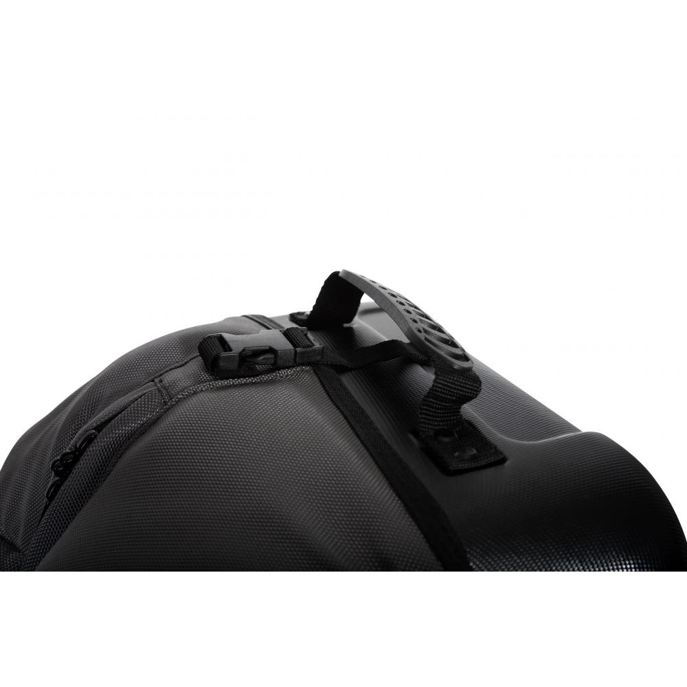 Mit Polsterung und festen Hartschalen im oberen und unteren Bereich, innenliegenden Reißverschlusstaschen für Caddyräder und Rahmenteile, verstärkter Rückwand und zwei leichtlaufenden Rollen, Gummigriff und ein Fenster für Namen und Adresse.