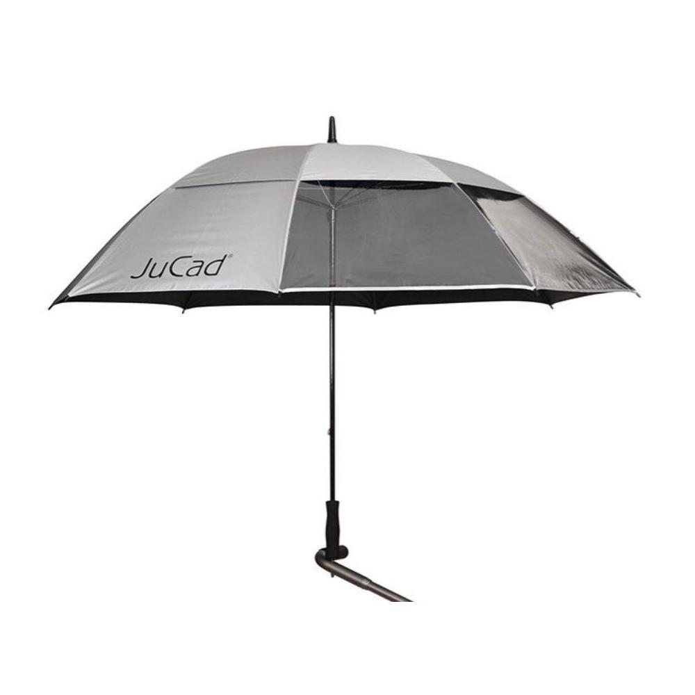 Der JuCad Golfschirm in quadratischer Form und mit Windproof Doppel-Layer bietet Ihnen extra Windschutz auf der Runde. Vollen Durchblick haben Sie dank doppeltem Sichtfenster über zwei der vorderen Schirmsegmente. Der Schirm ist zudem mit einem 99% UV-Schutz ausgerüstet (außer Sichtfenster). Inkl. Titanstift zur Befestigung  an der Schirmhalterung der JuCad Trolleys.