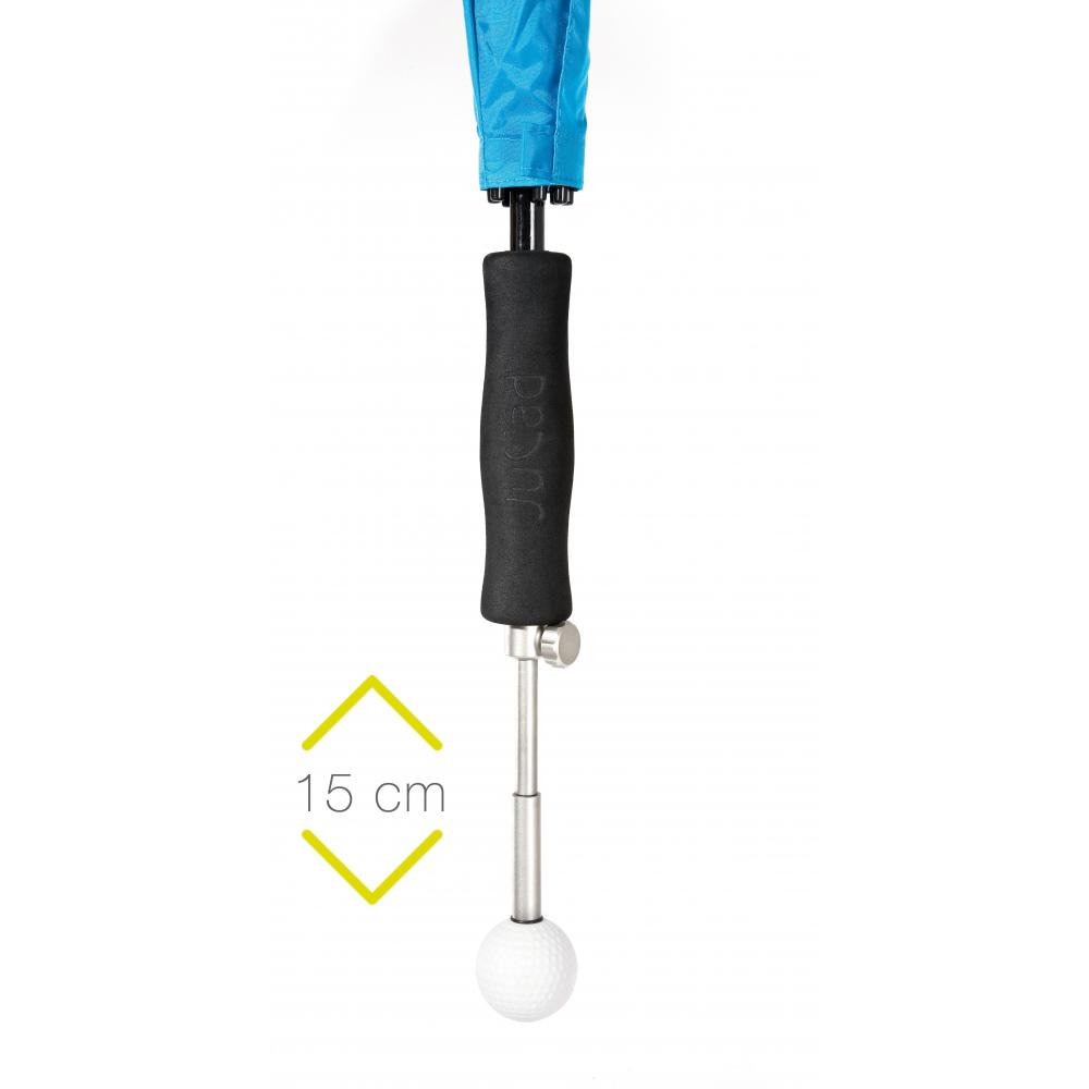 Teleskopschirm: ermöglicht eine stufenlose Verlängerung des Schirmschaftes um ca. 15cm, damit auch sehr große Golferinnen und Golfer bequem aufrecht unter dem Schirm stehen können.