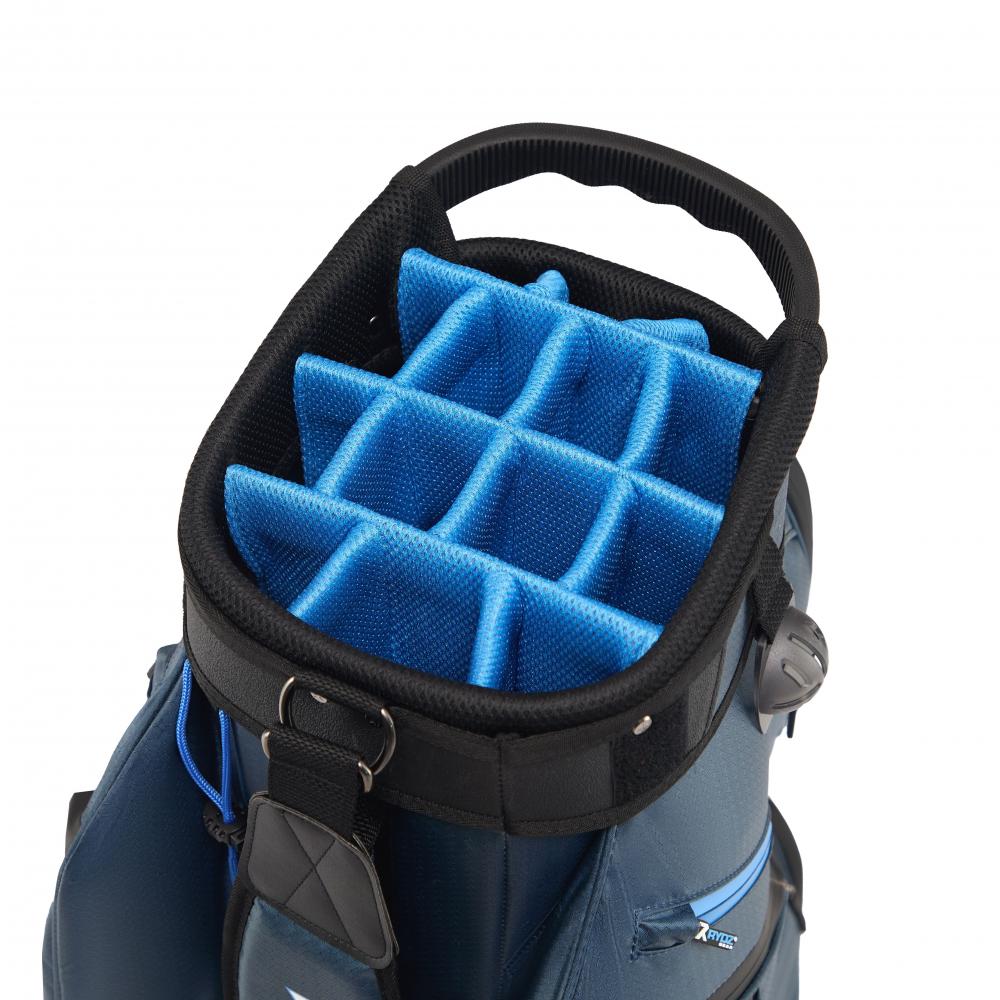 Das Rydz Gear Water Resistant Cartbag Firebee mit wasserabweisender Oberfläche und übersichtlicher Organisation im 14-Way-Mesh-Divider Top mit durchgehenden Unterteilungen zum Schutz der Schlägerschäfte.